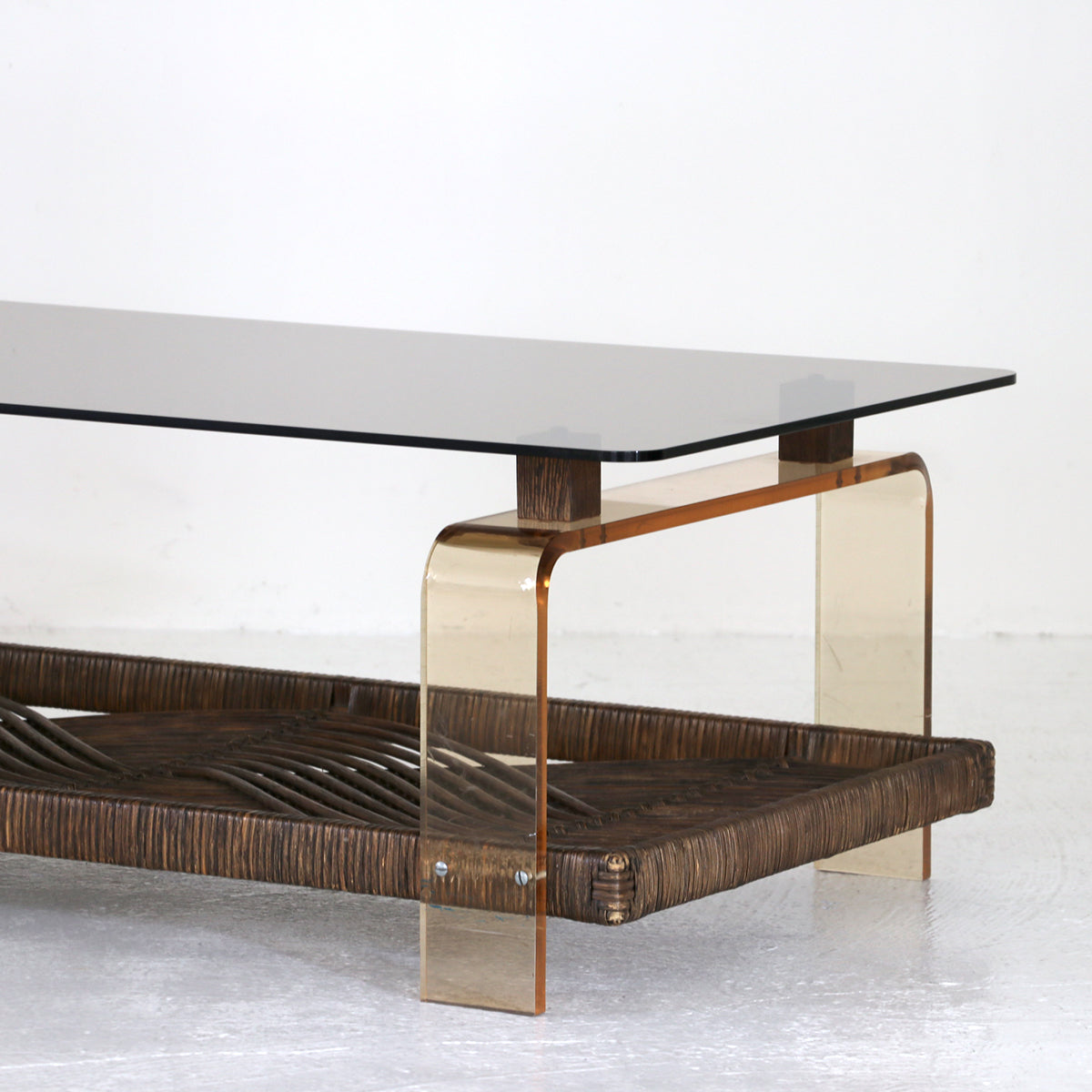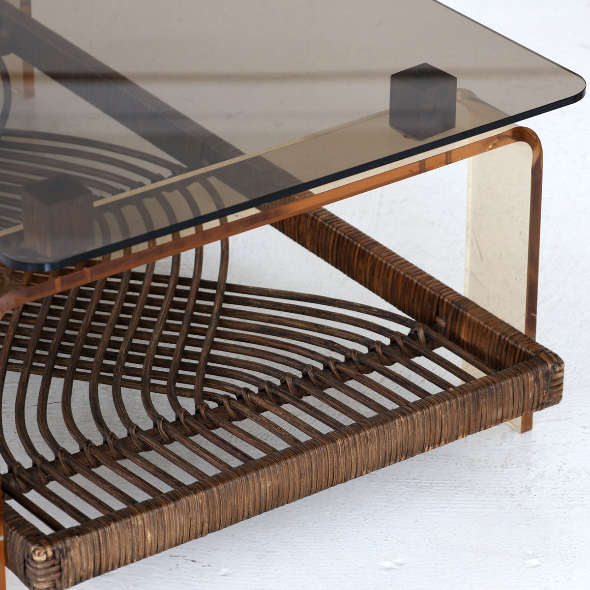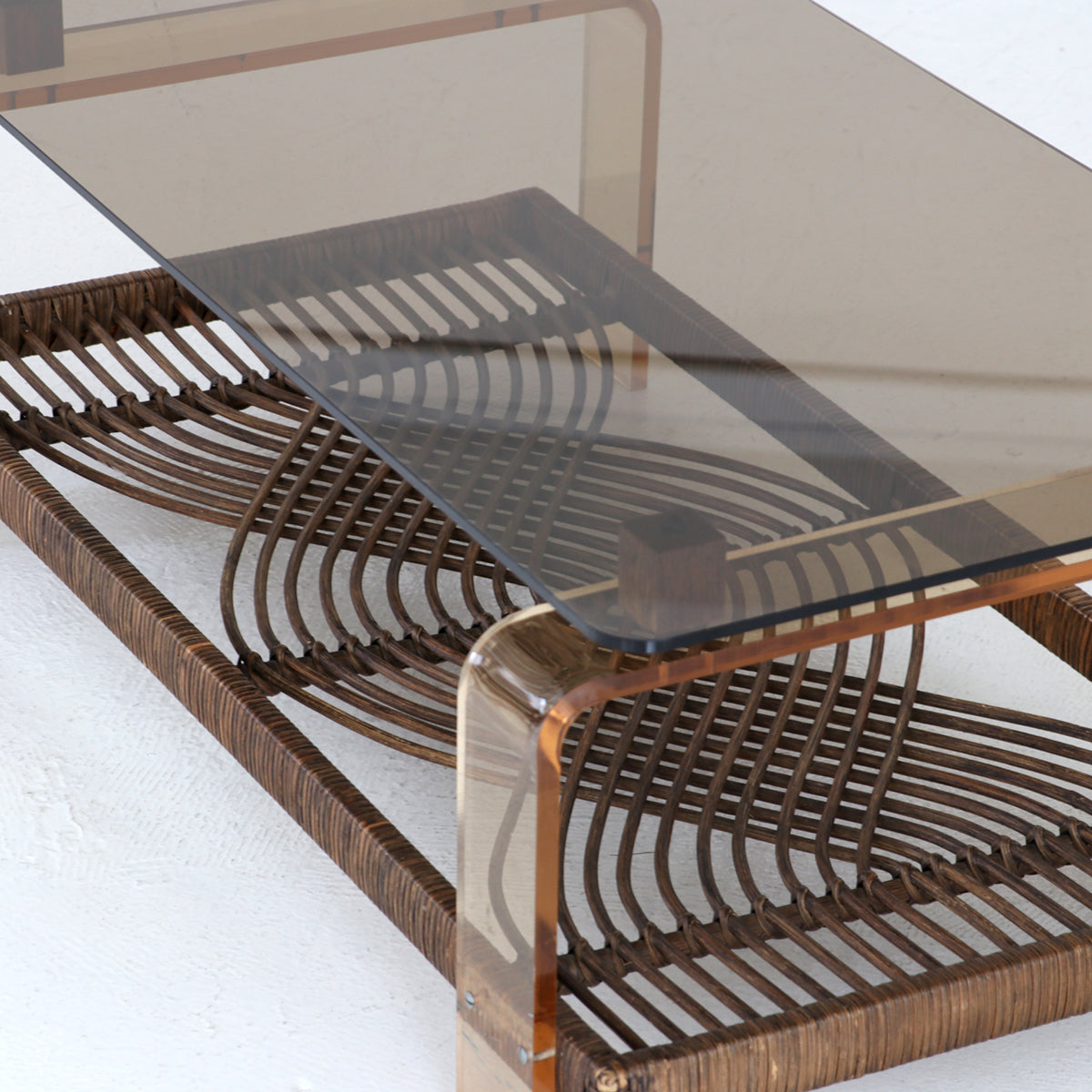 ラタンを使用した民藝的な要素にアクリルやガラスのスペーシーな素材の組み合わせが面白いコーヒーテーブル。