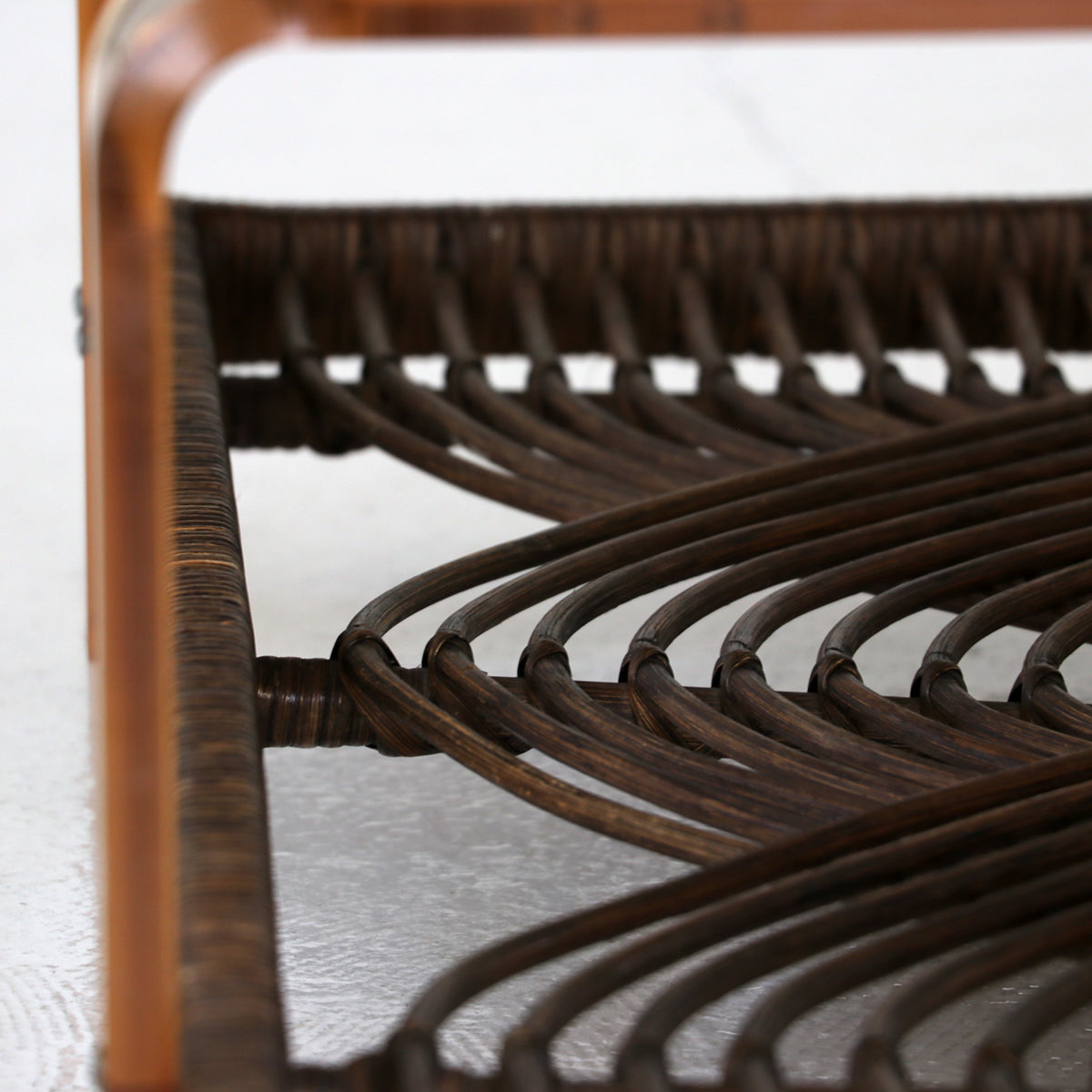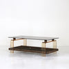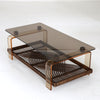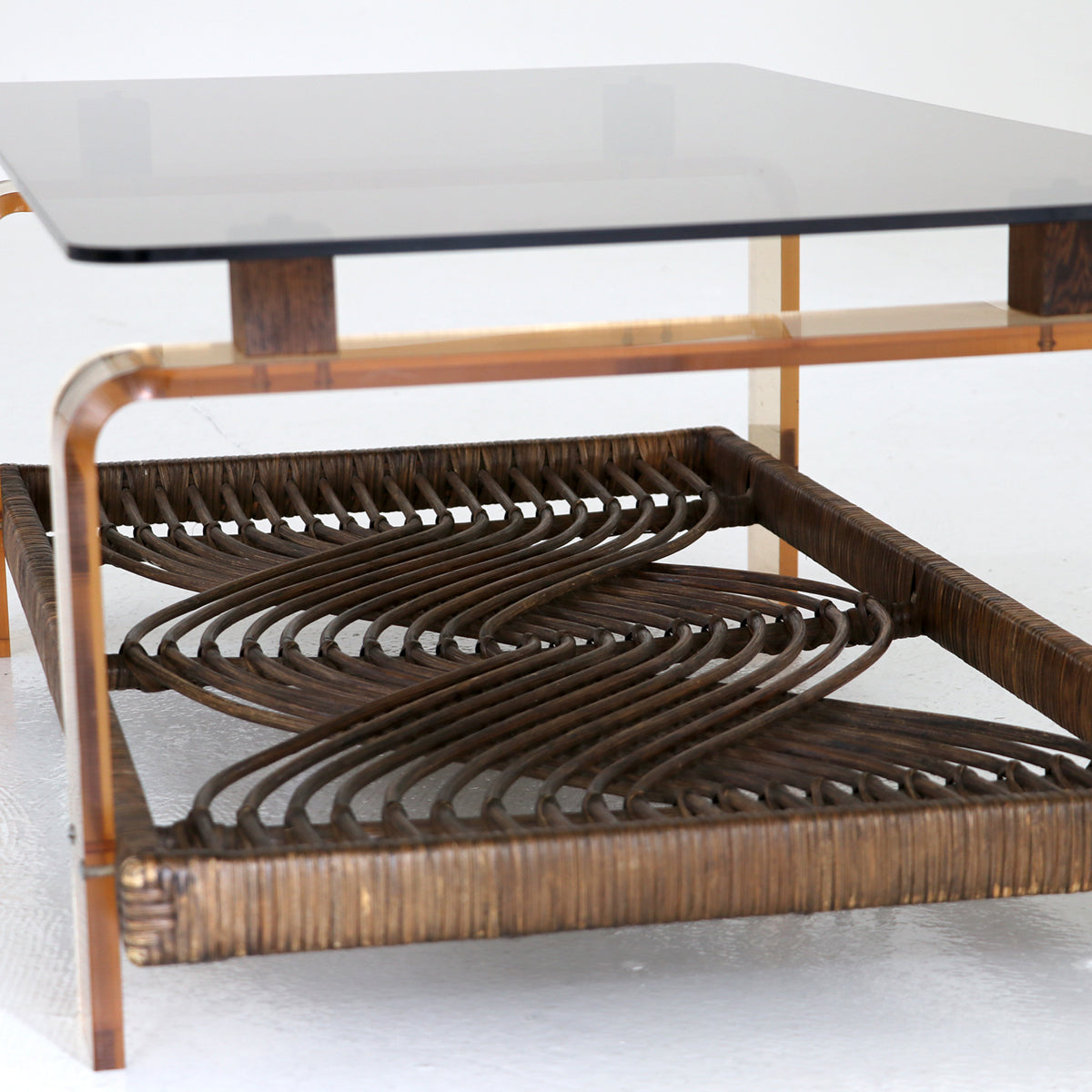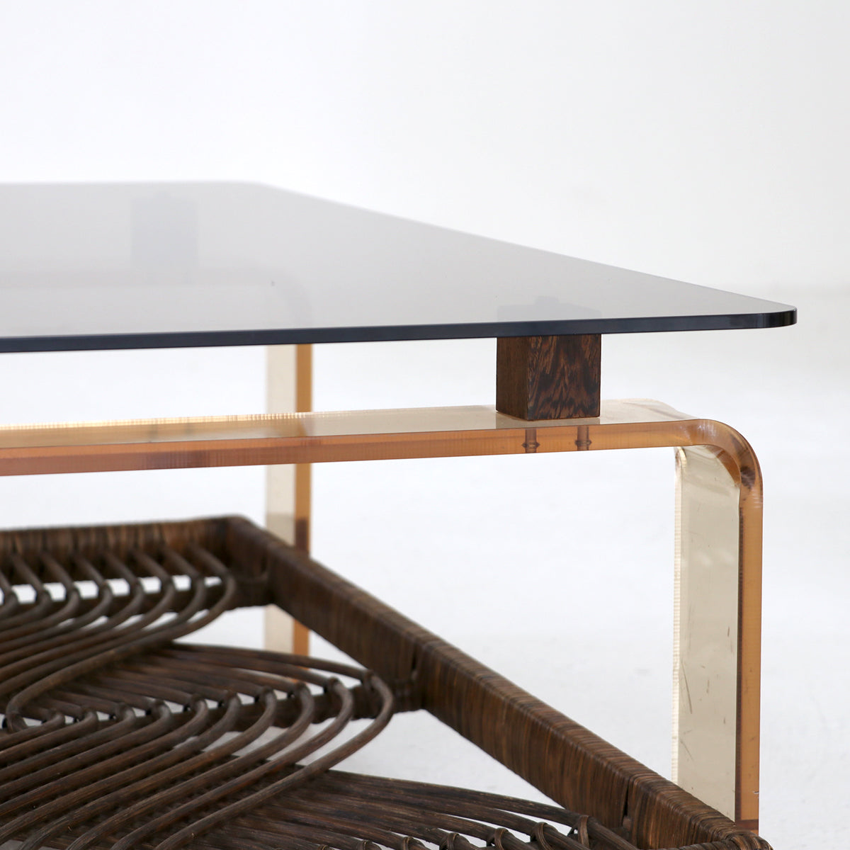 ラタンを使用した民藝的な要素にアクリルやガラスのスペーシーな素材の組み合わせが面白いコーヒーテーブル。