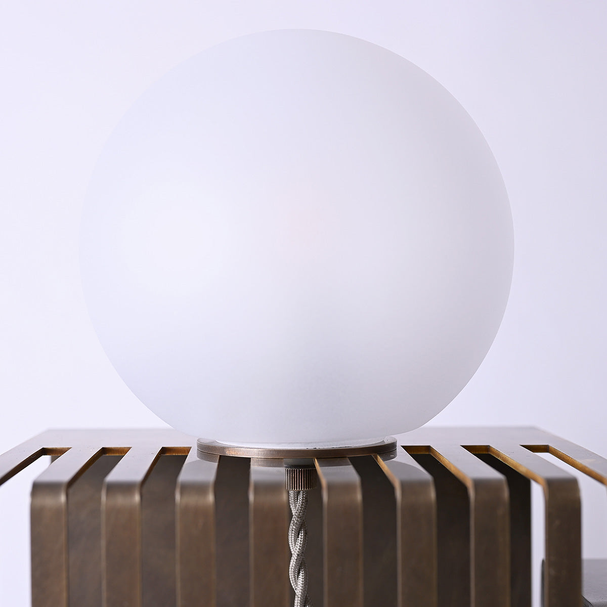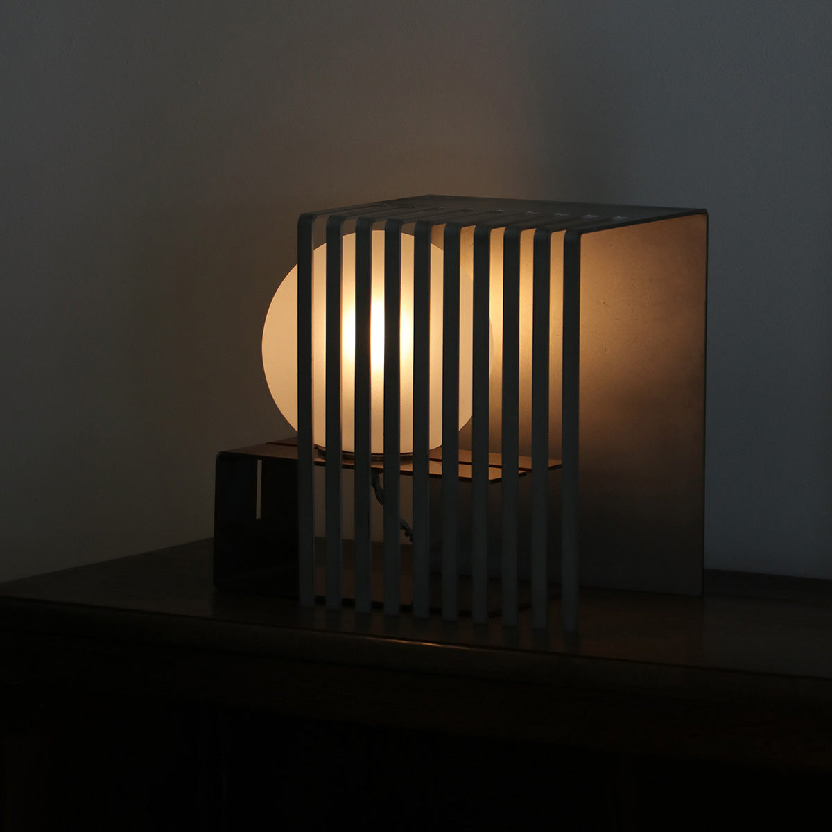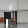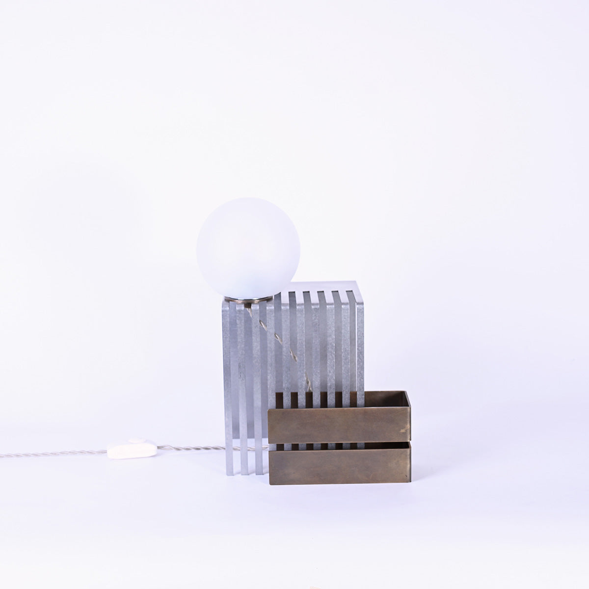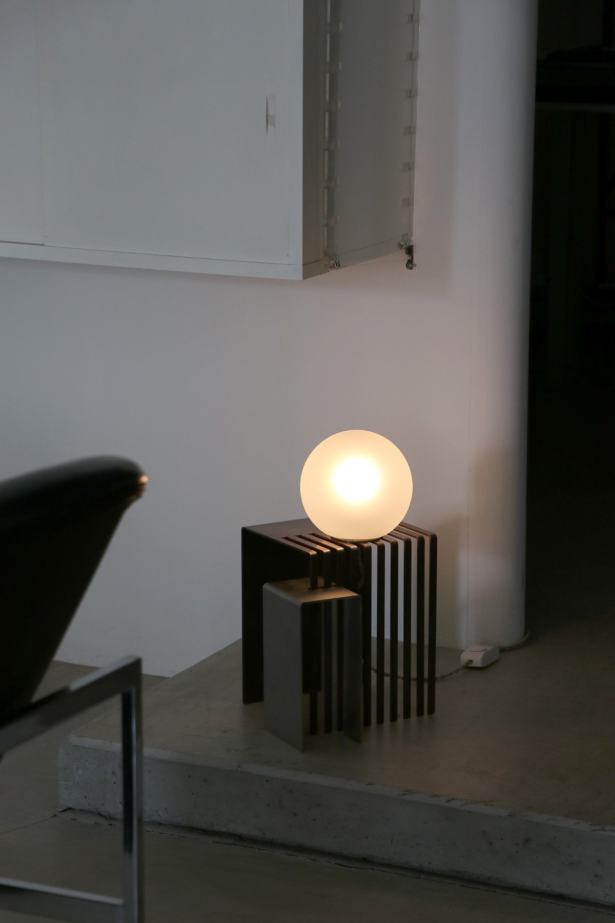 球体ガラスの灯具と二つの素材のオブジェクトから成り、使い手がスリットのライン上の好きな場所に球体を固定し自由に構成を組み替えられる照明です。