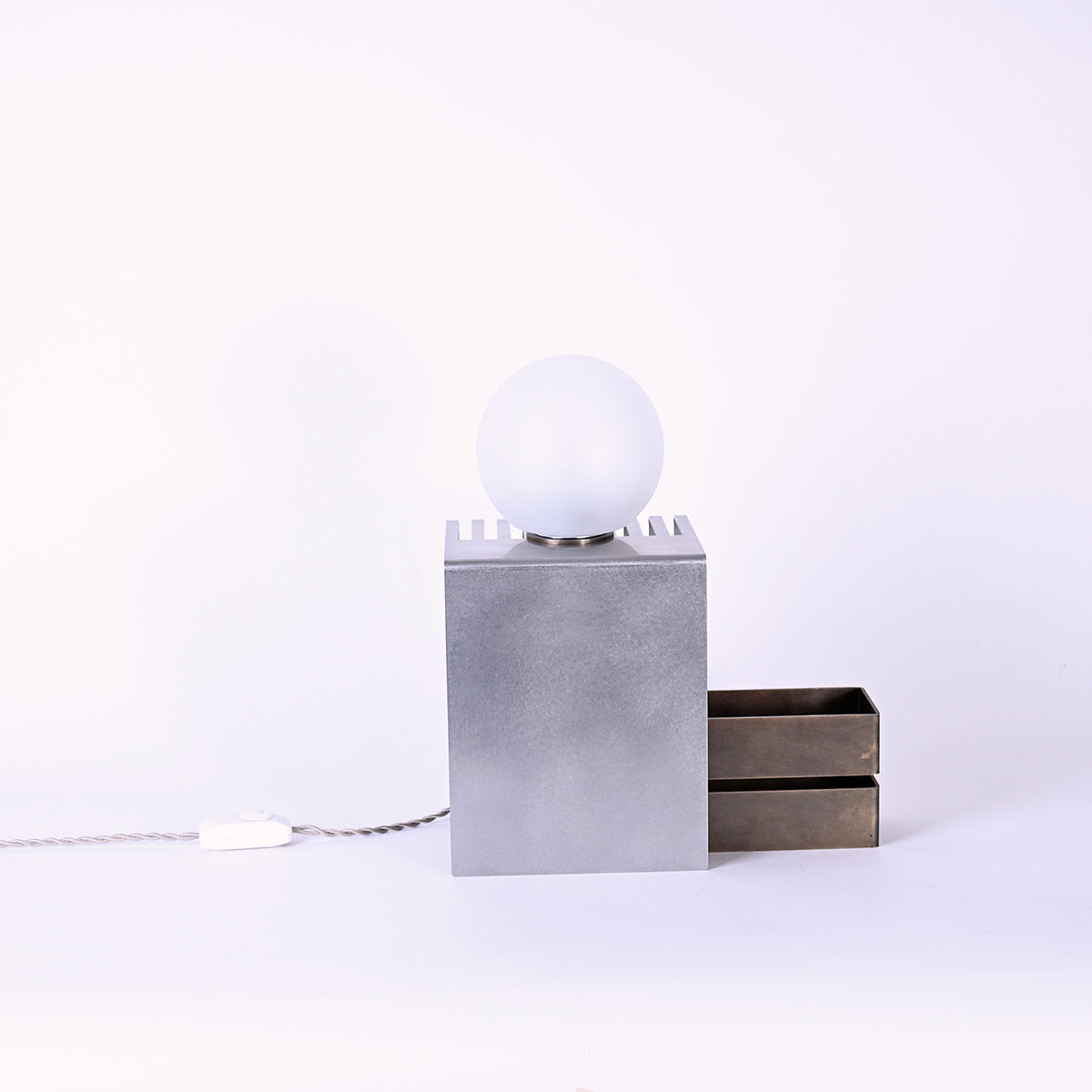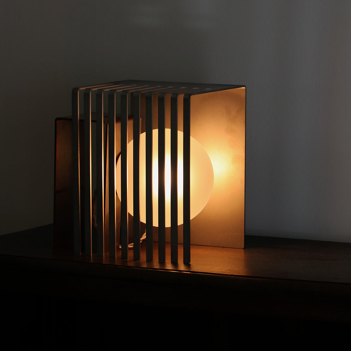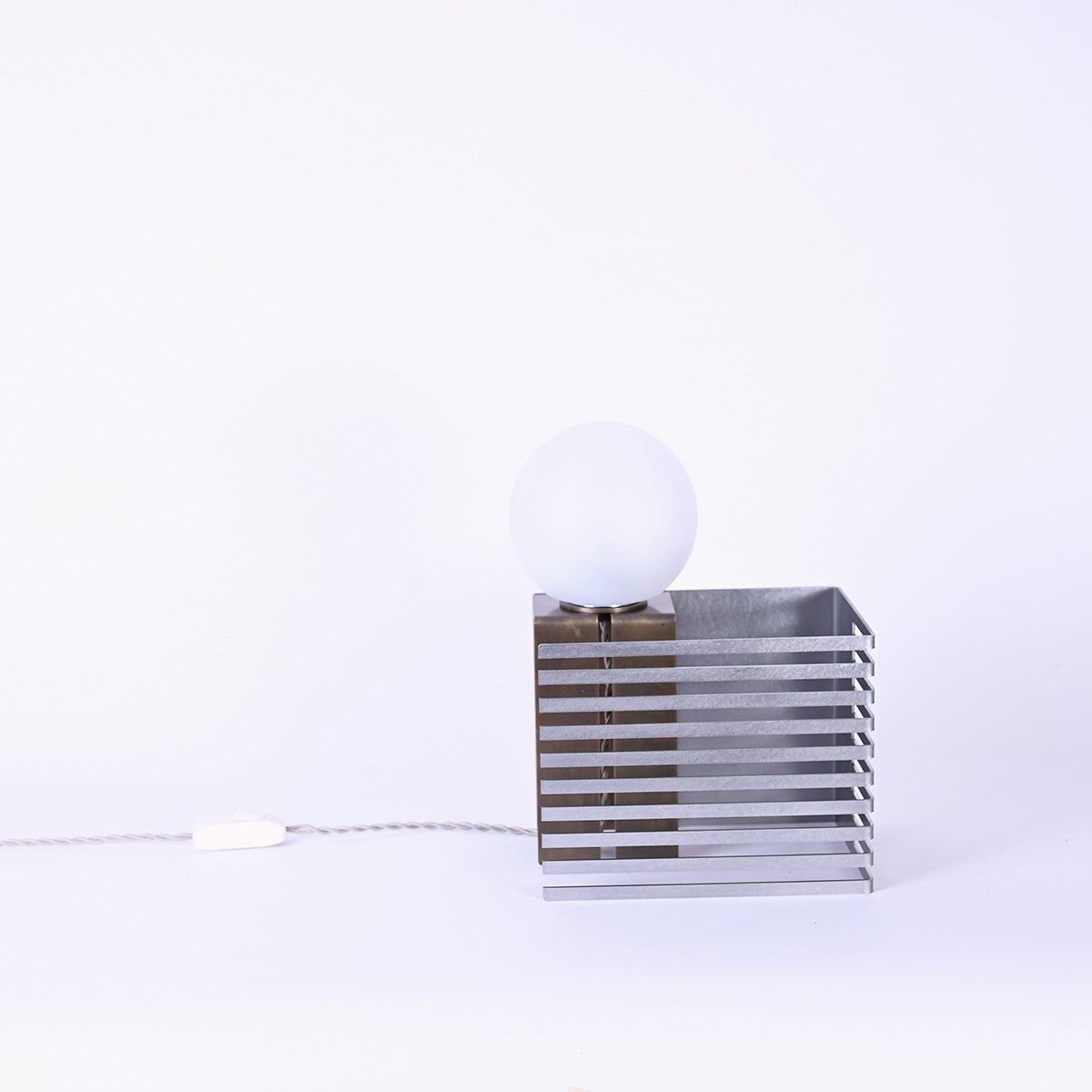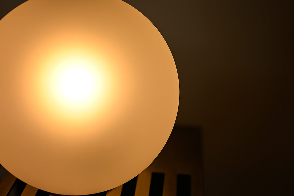 球体ガラスの灯具と二つの素材のオブジェクトから成り、使い手がスリットのライン上の好きな場所に球体を固定し自由に構成を組み替えられる照明です。