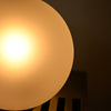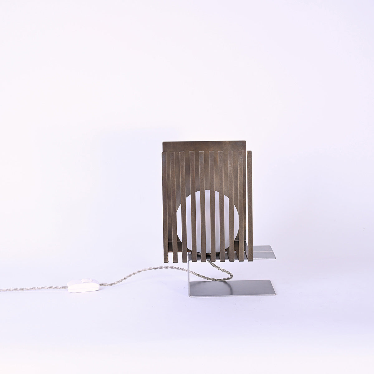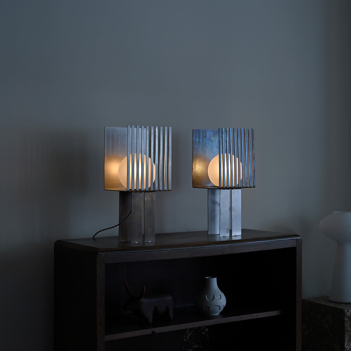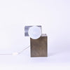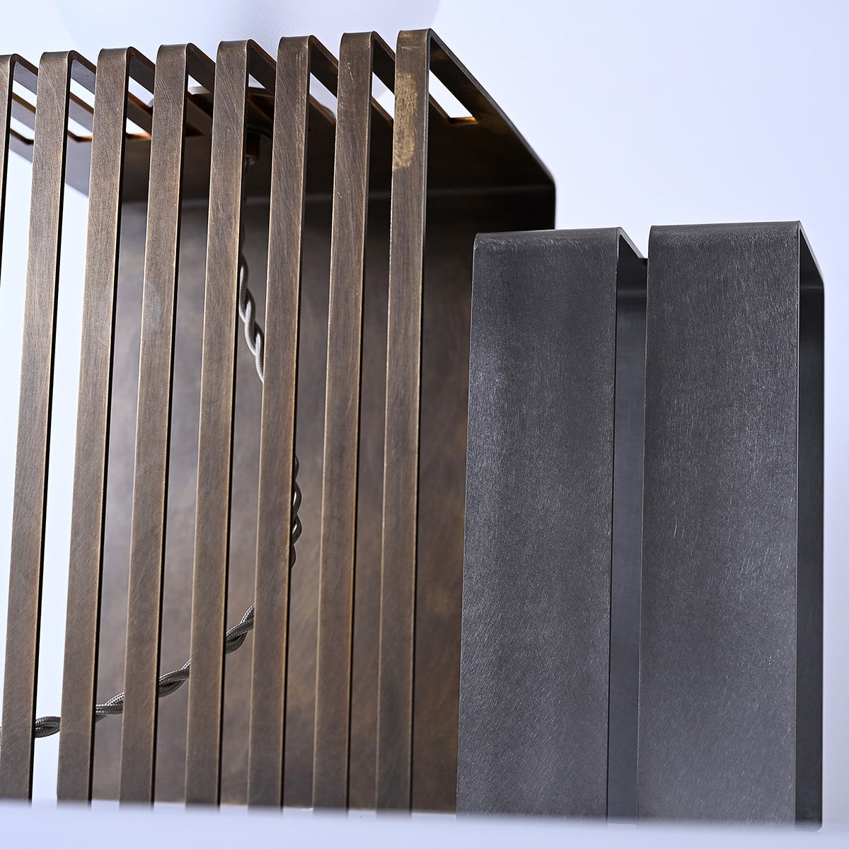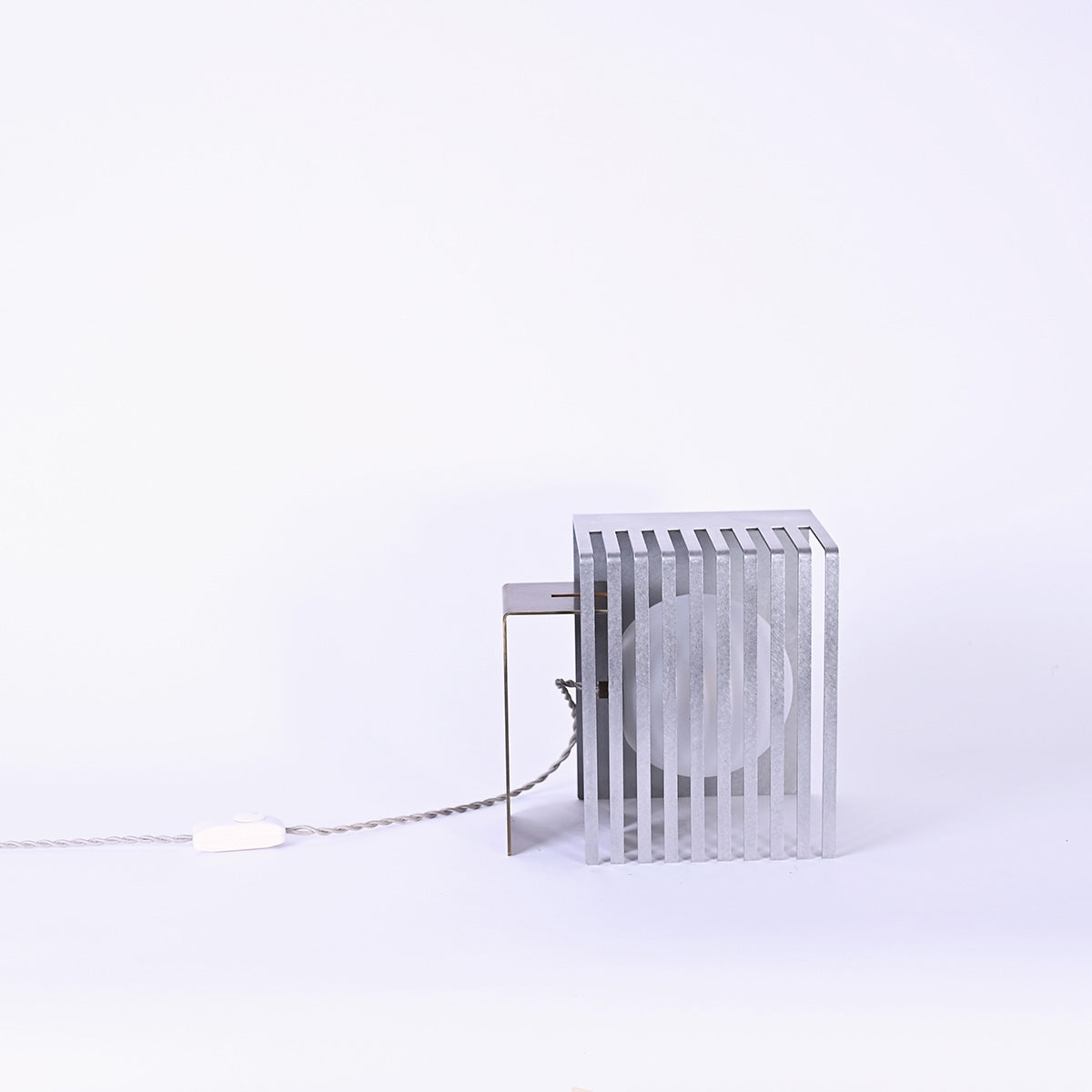 球体ガラスの灯具と二つの素材のオブジェクトから成り、使い手がスリットのライン上の好きな場所に球体を固定し自由に構成を組み替えられる照明です。