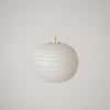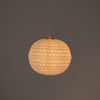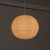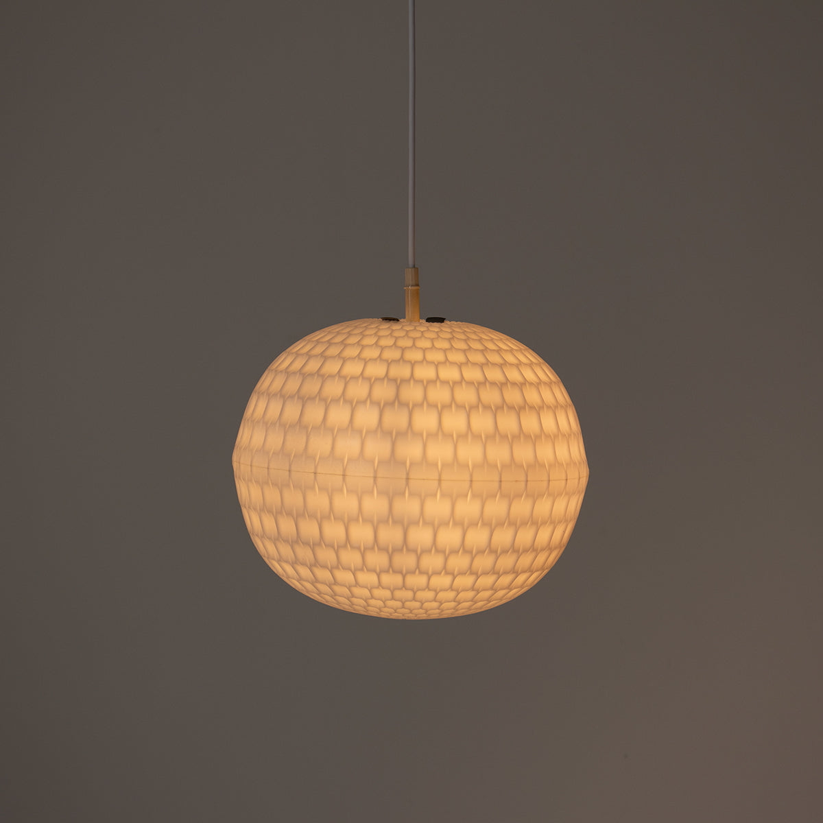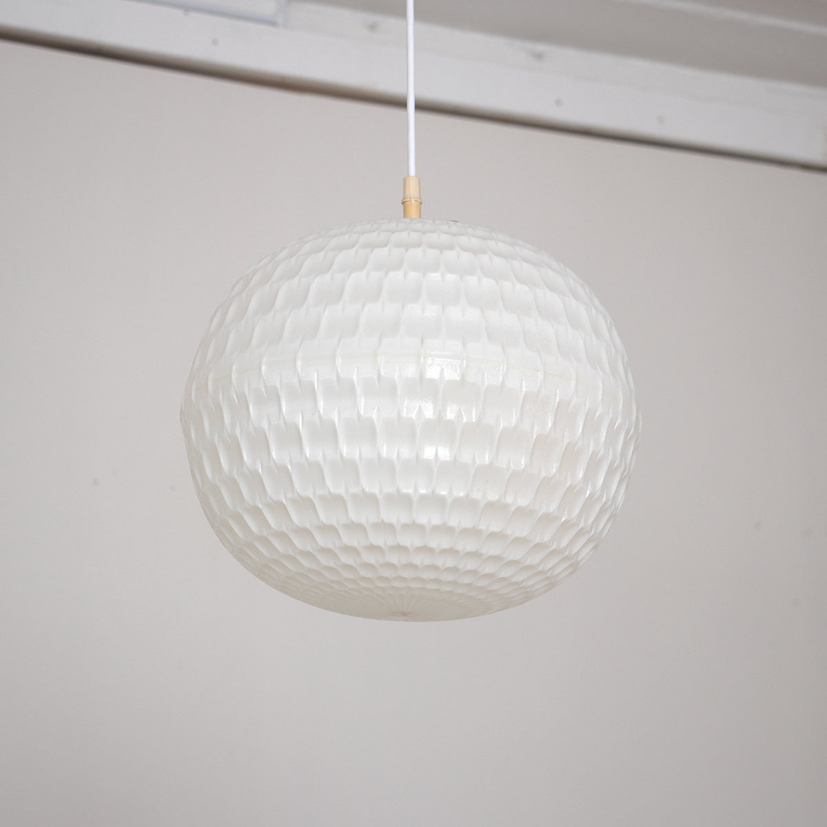 ライトの温かい光とともに浮かび上がる、幾何学模様のプラスチックシェードが特徴的です。昼と夜、それぞれの表情をお楽しみいただけます。